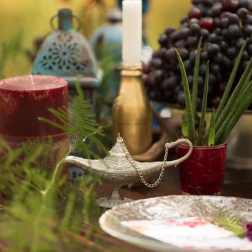 A festive Moroccan style setup of jewel tones and antique bronze.